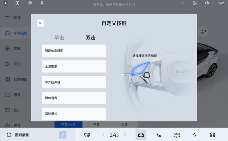 车控车设方面的优化同样贴合用户日常使用习惯。升级后优化了RPA泊车辅助这一辅助功能,让泊车过程更顺畅;方向盘自定义按键新增双击指令,用户可根据自身需求设置常用功能,操作更顺手;同时支持氛围灯亮度调节与地图导航音量记忆,每一处调整都从用户实际使用场景出发,实现千人千面的个性化体验。