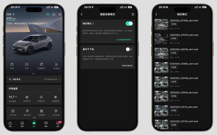 场景模式的优化让出行更具温度,其中新增的宠物模式精准契合养宠家庭需求。当车主临时离车且宠物留在车内时,该模式会自动开启离车不下电、空调外循环,关闭小窗并屏蔽状态栏与任务栏,中控屏同步展示宠物关怀界面,为宠物构筑安全舒适的移动空间,让车主无需再为宠物留车而焦虑。同时,升级后的哨兵模式在车辆异常触发监控后,会将视频按时间倒序排列并区分高、低风险类别,云端分别保留10条对应记录,更多视频可在车机内查看,为车辆安全提供全方位保障。
