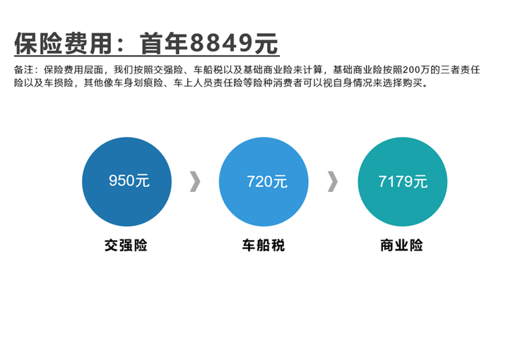 保险费用层面,我们按照交强险、车船税以及基础商业险来计算,基础商业险按照200万的三者责任险以及车损险,其他像车身划痕险、车上人员责任险等额外险种消费者可以视自身情况来选择购买。另外,此价格也不考虑之后几年不出险的折扣以及保险公司的优惠等。