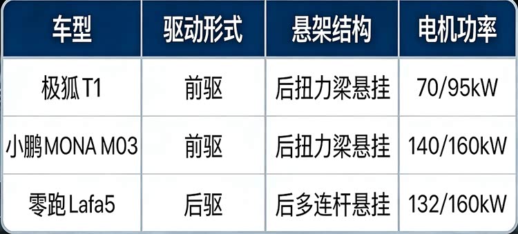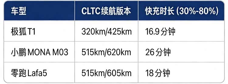 对电车车主而言,除了价格,续航与补能速度是他们关注的重中之重。极狐T1的续航分320km和425km两个版本,日常通勤够使,但想跑个周边游就有点捉襟见肘,不过它快充挺给力,30%-80%只要16.9分钟;小鹏MONA M03续航要好很多,毕竟价格贵不少,起步515km续航,长续航版620km,快充30%-80%仅需26分钟,满足长途需求没问题;零跑Lafa5续航表现更趋向于MONA M03,给到515km和605km两个续航版本,快充18分钟就能从30%充到80%,比小鹏还快,而且它有CTC2.0 Plus电池底盘一体化技术,热失控48小时不起火,首任车主还能享三电终身质保,冬天续航也不怎么跳水,相对来说更全面一些。