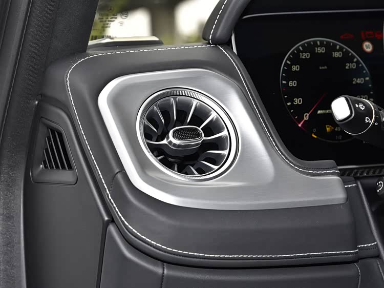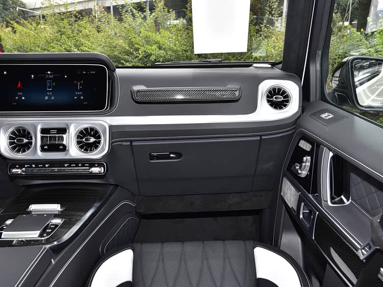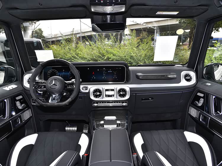 进入车内,内饰色调与外观呼应,以黑色为基底,在座椅缝线、仪表台饰条以及方向盘部分区域融入了白色元素。实拍车辆选装了融合碳纤维与Alcantara材质的方向盘,触感和视觉感受都比较特别。中控台依然是由两块12.3英寸屏幕组成的连体式设计,屏幕下方整齐排列着三把差速锁的控制按键以及经典的空调出风口。此外,车辆配备了拥有18个扬声器的柏林之声音响系统。