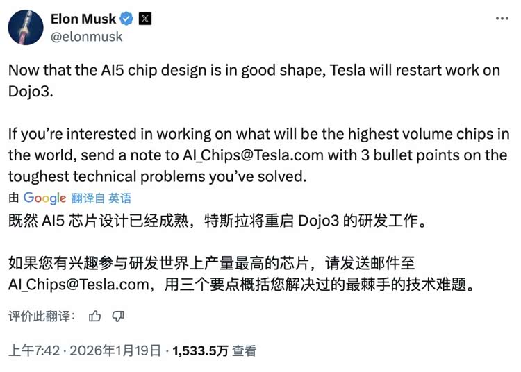 1月19日,特斯拉创始人马斯克在X平台发文宣布,随着AI5芯片设计完成,公司将重启超级计算机项目Dojo 3的开发工作。同时,他发出“英雄帖”,招聘人才参与研发“世界上产量最高的芯片”,并要求用三个要点介绍自己解决过的最棘手技术难题。