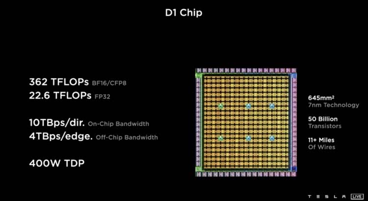 2021年特斯拉AI Day上,首款用于打造Dojo的芯片D1亮相,采用分布式结构和7纳米工艺,搭载500亿个晶体管、354个训练节点,仅内部的电路就长达17.7公里,实现了超强算力和超高带宽。