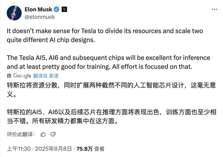 对此,马斯克本人给出的解释是,分散资源设计两款不同的芯片没有意义。