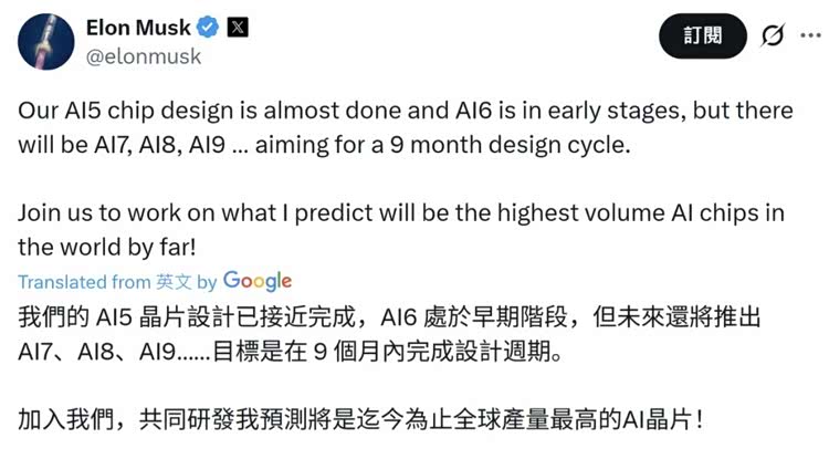 根据马斯克透露,特斯拉AI5芯片已接近设计完成,而AI6芯片目前处于早期阶段,后续还将推出AI7、AI8、AI9,目标是在9个月内完成设计周期。