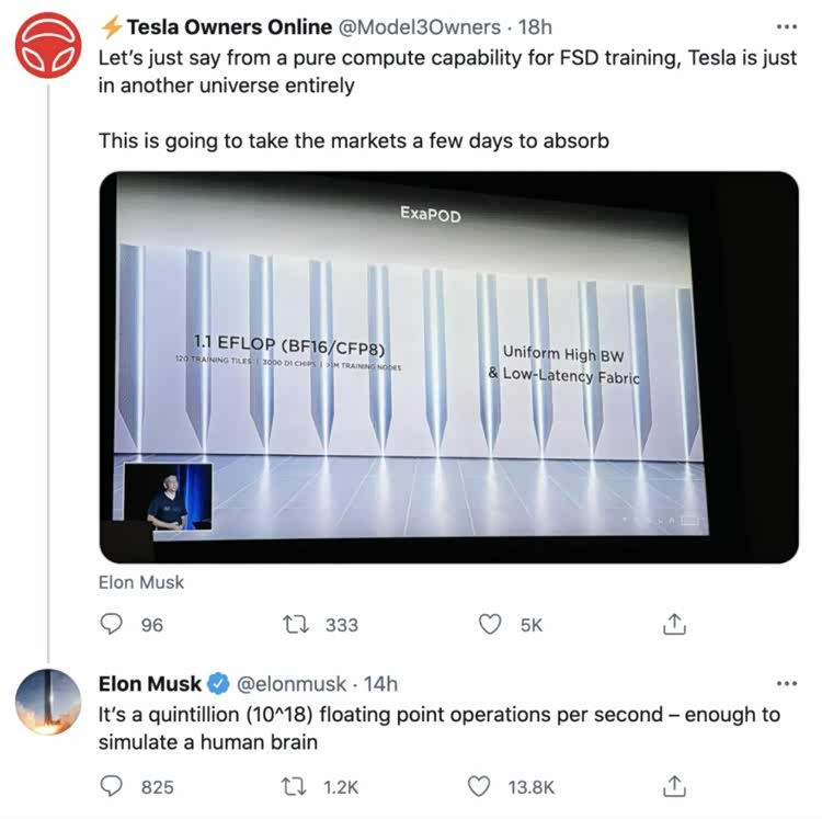 彼时,马斯克还在推特上回复网友时表示,ExaPOD的运算能力足以模拟人脑。而这仅仅是一个开始,他称下一代Dojo还将得到10倍的性能提升。