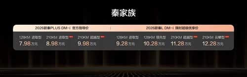 除了出色的产品力,新车上市后还有丰厚的购车福利,难怪销量这么顶!1月31日前下单2026款秦PLUS DM-i,享包括置换补贴在内的至高11000元多重权益;同时段下单秦L DM-i,享包括限时超级购置税补贴在内的至高15000元多重权益。春节将至,现在正是购车好时机!如果你年前有购车的打算,可以前往4S店试驾体验一下。