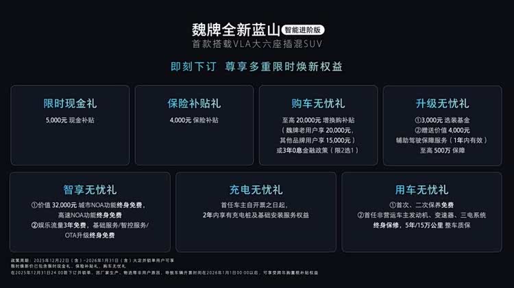 为让更多用户轻松拥有“为爱进阶”的出行体验,魏牌全新蓝山智能进阶版同步推出诚意十足的购车权益:限时现金礼:5,000元现金补贴。保险补贴礼:4,000元保险补贴购车无忧礼(限2选1):①至高20,000元增换购补贴(魏牌老用户享20,000元,其他品牌用户享15,000元)②3年0息金融政策。充电无忧礼:首任车主自开票之日起,2年内享有充电桩及基础安装服务权益。升级无忧礼:①3,000元选装基金;②赠送价值4,000元辅助驾驶保障服务(1年内有效)至高500万保障。智享无忧礼:①价值32,000元城市NOA功能终身免费,高速NOA功能终身免费;②娱乐流量3年免费,基础服务/智控服务/OTA升级终身免费。用车无忧礼:①首次、二次保养免费;②首任非营运车主发动机、变速器、三电系统终身保修,5年/15万公里整车质保。*限时焕新价已包含限时现金礼,保险补贴礼,购车无忧礼。