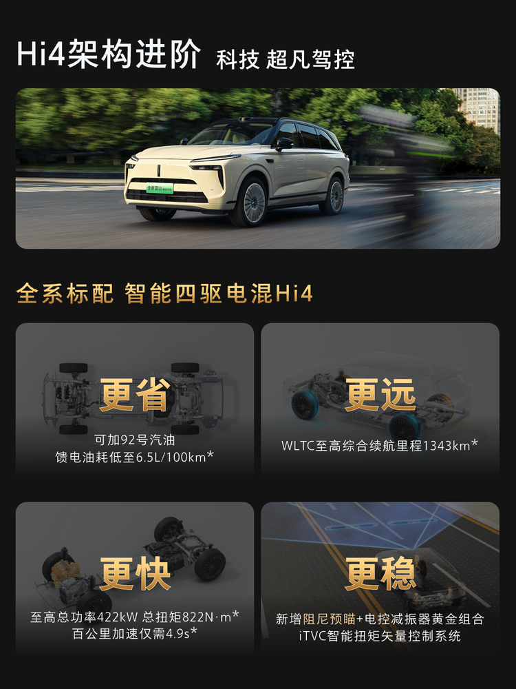 为支持VLA大模型的流畅运行,全新蓝山智能进阶版搭载了算力达700 TOPS的Thor-U芯片,像一颗“超级大脑”为VLA高效执行,持续提供高稳定而充沛的算力。“超级大脑”之外,全新蓝山智能进阶版还配备了27颗智慧传感器,通过合理的布局,高效的协同,能够在雨雾等复杂环境下,快速识别潜在风险。Hi4性能版智能四驱,以“都江堰智慧”实现全场景省、远、快、稳当智慧的“大脑”完成对环境的感知知与决策,接下来便需要一副敏捷而强健的“体魄”来完美执行。全新蓝山智能进阶版在动力系统上搭载Hi4性能版,如“都江堰”的智慧,通过“因势利导,智能调度”,可实现全场景的从容、高效与稳定。