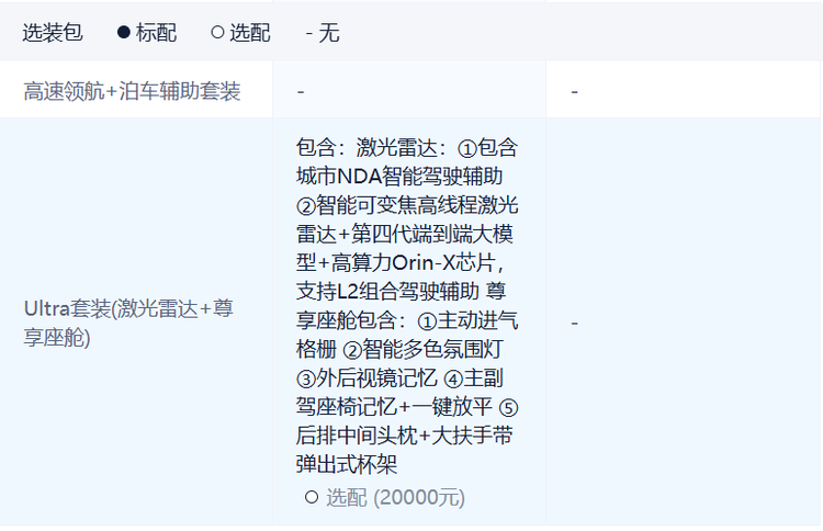 如果预算充足,追求更极致的舒适体验,可选择顶配版+20000元的辅助驾驶包——Ultra套装(激光雷达+尊享座舱)选装来进一步提升通勤便利性和主被动安全性,毕竟在优惠后四舍五入等于免费,免费这个字眼,相信很多人听了都会原地上头。