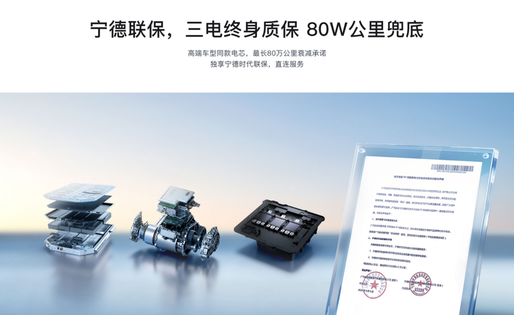 终身质保礼:三电系统终身质保(仅限首任私人车主,年行驶里程≤3万公里),电池整包终身质保+宁德时代直联服务,整车4年或15万公里质保。