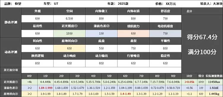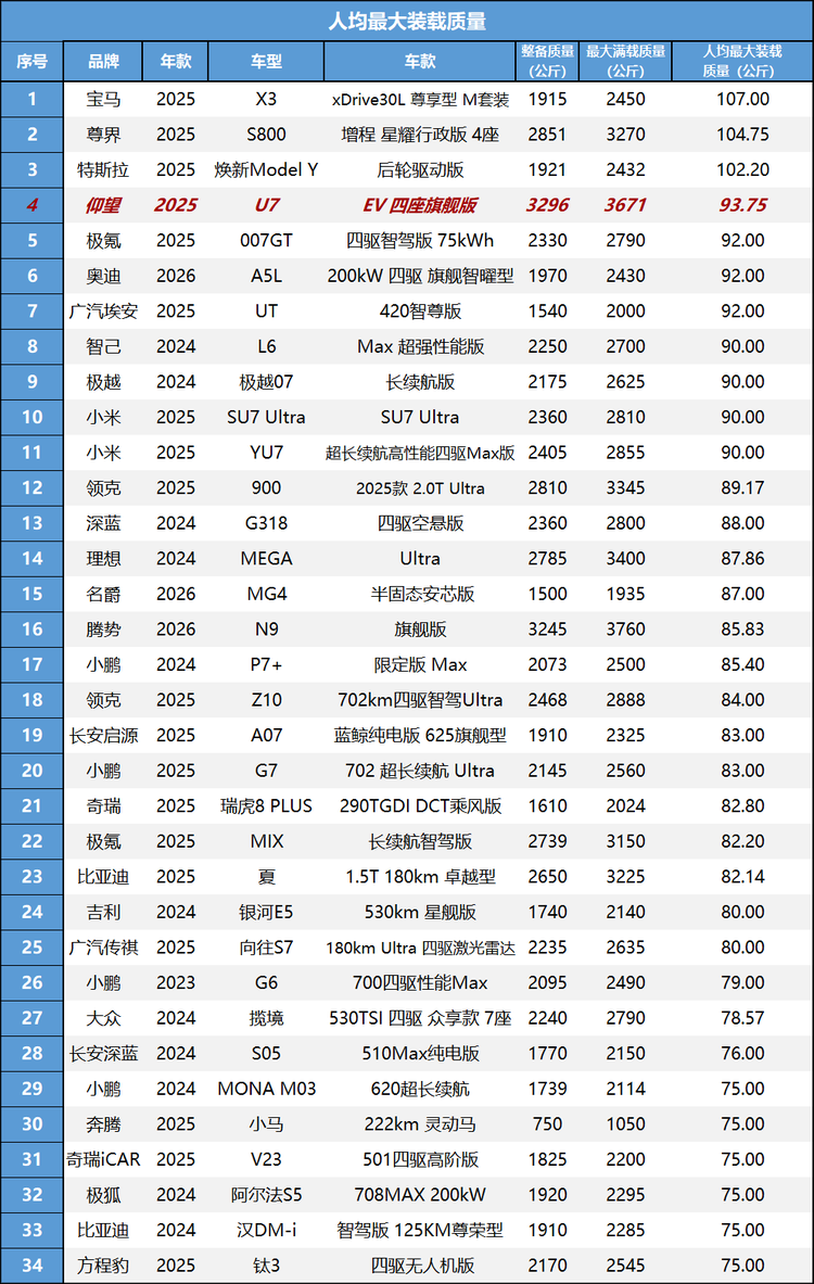 我们这辆车的整备质量为3296千克,最大满载质量为3671千克,计算得出这辆仰望U7纯电四座旗舰版的人均最大装载质量为93.75千克,比标准高18.75千克。如果是5座版本,那么人均最大装载质量为75千克,将将够“及格线”。