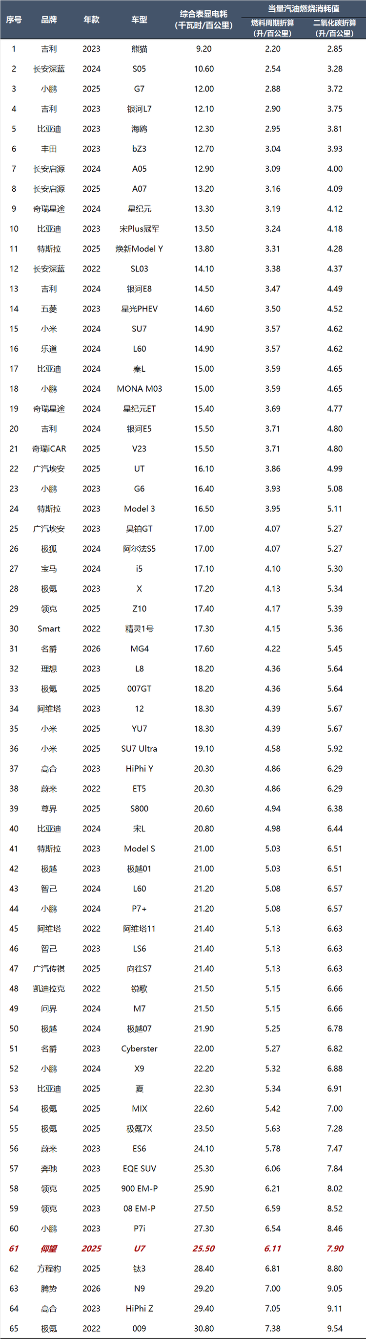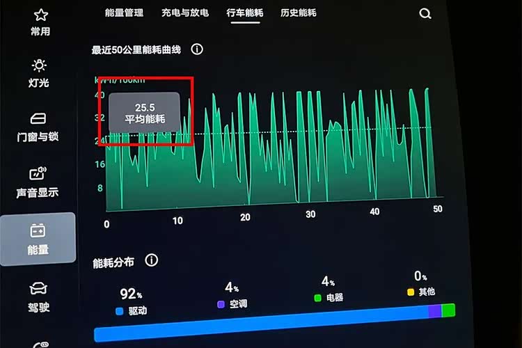 根据表显近百公里的平均电耗25.5千瓦时,由国标计算公式可以得出,按照燃料生命周期计算,当量汽油百公里消耗为6.11升;如果按照二氧化碳排放量计算,当量汽油百公里消耗为7.9升。