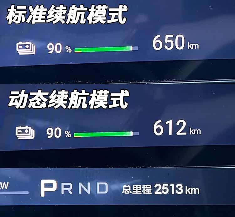 这辆车搭载了一块135.5千瓦时的磷酸铁锂刀片电池,CLTC标称续航里程720公里。在北京冬季平均零下-2摄氏度左右的气温下测试,充电至90%,标准显示续航里程650公里,动态续航显示里程612公里。行驶到电量剩余25%时,标准显示可续航里程179公里,动态显示可续航里程164公里。标准模式表显消耗里程471公里,动态模式表现消耗里程448公里,实际行驶里程291公里。计算得出标准模式表显准确率为61.78%,动态模式表显准确率为64.96%,CLTC续航里程估算获得率为62.18%。