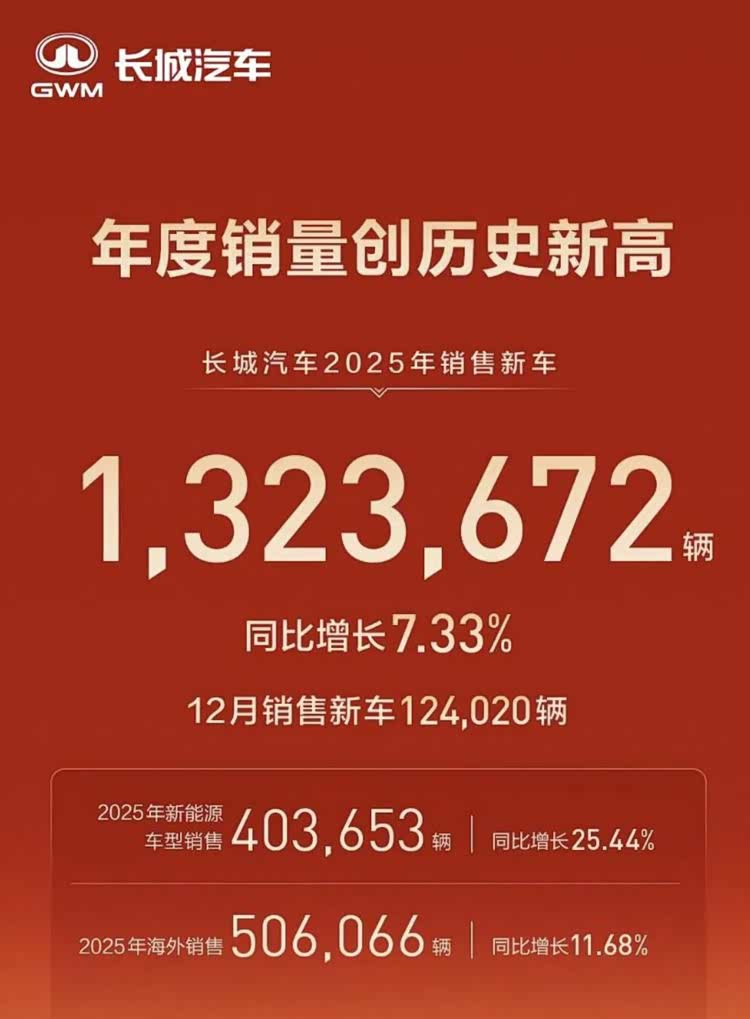 2025年,长城汽车的新能源和海外销量都刷新了记录,这对于它来说算是一大进步,但如果想赶超比亚迪,还是任重而道远,2026年的销量能达到150万辆吗?
