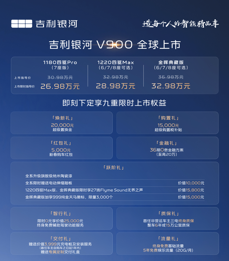 1月20日,吉利银河V系列的首款MPV吉利 银河V900(参数|询价)正式上市,新车定位“AI全场景家庭旗舰MPV”,提供三个版本(Pro版、Max版、金晖典藏版)可供大家选择,限时指导价26.98万元 - 32.98万元,较此前31.98万-38.98万元的预售价,最高降幅达5万元~6万元。直接进入了原本由腾势D9 DM-i、魏牌高山等车型主导的主流新能源MPV市场。