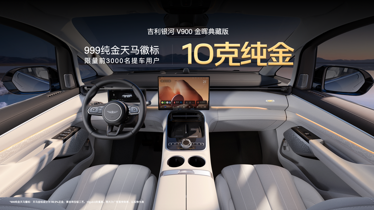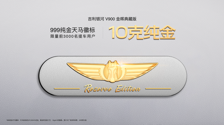 吉利银河V900有一个特殊的版本叫金晖典藏版。前3000名金晖典藏版提车用户,吉利银河免费送10克999纯金天马徽标。