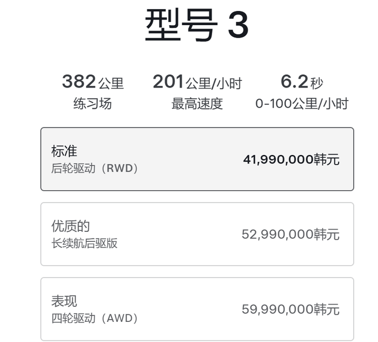 在“廉价版Model 3”尚未登录韩国市场前,当地卖得最便宜的特斯拉Model 3 长续航后轮驱动版售价是5299万韩元,折合人民币约25.12万元。相比之下,“廉价版Model 3”的价格门槛将了约5.26万元人民币,对当地的刚需型用户而言或许是有吸引力的。
