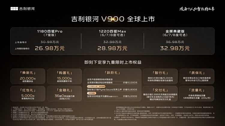 2026年1月20日,吉利银河豪华V系列首发车型——“AI全场景家庭旗舰MPV” 吉利银河V900正式上市。新车共推出3个配置版本,分别为1180四驱Pro(7座版)、1220四驱Max(6/7/8座可选)、金晖典藏版(6/7/8座可选),官方指导价区间为30.98 万元-36.98 万元,当前上市期的限时指导价区间为26.98万-32.98万元。