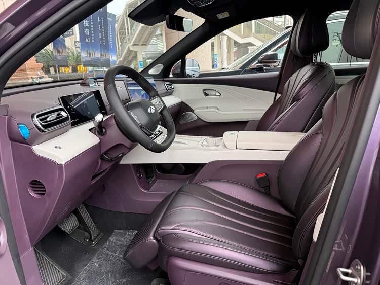车身尺寸长宽高分别为4870*1930*1710mm,轴距2920mm,相比同级宋L DM-i、海狮06DM-i等更大一些。车身侧面采用饱满、敦实的溜背式造型,配合大量熏黑饰件,很有运动感。而半隐藏式门把手、无边框外后视镜、花瓣式轮毂以及贯穿式尾灯的加持,再配合紫色涂装,又进一步提升了时尚感。尾部大面积熏黑后包围处又加入夸张的扩散器,加之环形尾翼,继续强调性能感。