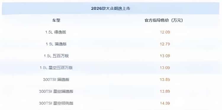 车家号·0浏览·2026-01-21 17:16 · 重庆2026年1月20日,上汽大众正式宣布2026款大众朗逸上市。此次年度改款车型推出了七种配置可选,官方指导价区间为12.09万-15.19万元,限时优惠价8.38万元起。作为中国紧凑型轿车市场的常青树,朗逸此次改款聚焦配置优化与智能化升级,试图在竞争日益激烈的市场中保持竞争力。