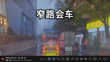 对辅助驾驶考验最大的还是窄路会车,这条路上右边停满了车,路上没有清晰的车道线,因为施工,对向车辆直接借道行驶,导致整个车道情况极为复杂拥挤。理想能清晰地认知路况,在没有任何减速的情况下轻松完成了会车,并非常高效地通过了路口。