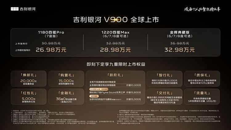 1月20日,吉利银河旗下中大型MPV—— 银河V900(参数|询价)上市,共推出3个车型,售价区间为30.98-36.98万,上市限时指导售价为26.98-32.98万。银河V900定位增程车,CLTC纯电续航为260km,满油满电综合续航为1220km,既提供三排的6座与7座布局,同时也是市面上罕有的四排8座的乘用MPV。