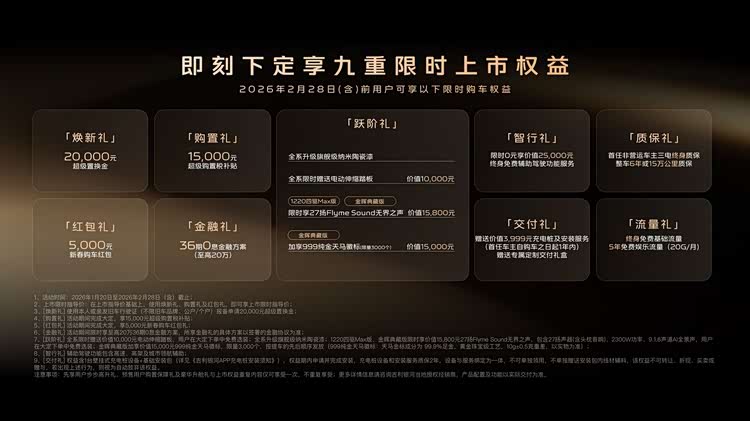 内饰方面,车辆采用平直的中控台线条,搭载由15.4英寸中控屏、10.25英寸仪表屏和19.8英寸AR-HUD组成的显示系统,内置Flyme Auto 2智能座舱,核心为骁龙8295P芯片。车辆还配备了9.2英寸高清流媒体后视镜以及拥有27个扬声器、功率达2300瓦的Flyme Sound无界之声系统,支持AI无麦K歌功能。晨曦米与霞光橙两款内饰配色为车内增添了温馨感。
