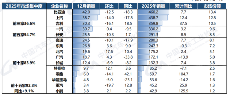 目前的汽车头部企业——比亚迪、吉利、长安、奇瑞等,都是以新能源汽车为主要特征,比亚迪汽车去年是460万辆,全都是新能源汽车;吉利汽车300多万辆,长安汽车291万辆,大部分都是新能源汽车;奇瑞汽车在新能源占比没有那么高,但是2025年也是突飞猛进,全年新能源汽车销量也达到了90.38万辆。所以,头部企业也将市场集中在了新能源汽车和智能汽车上。