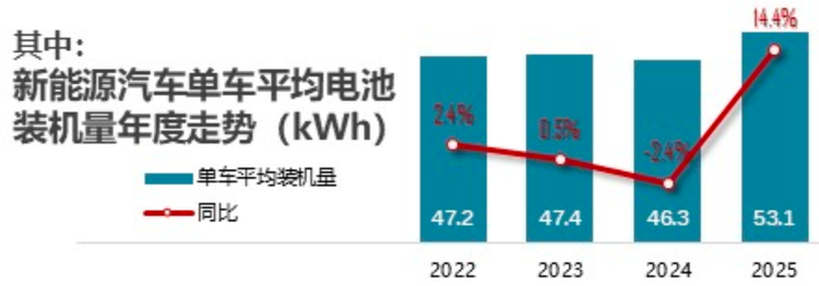 动力电池,主要指电芯。在新能源汽车上的单车平均装机量从前几年的47度跃升到2025年的53度,可以预见,随着“大电池+小油箱”以及国家政策要求的100公里以上续航的普及,电池的供需矛盾会越来越尖锐。电池仍是掣肘新车交付的重要因素之一。