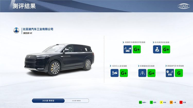 腾势N9在耐撞性与维修经济性、车内乘员安全、车外行人安全、辅助安全四大核心分指数中均斩获最高等级优秀+(G+)评价,新能源汽车专项指数获优秀(G)评价,全维度卓越安全成绩。在中国保险汽车安全指数C-IASI测试成绩中,腾势N9实现全优大满贯!是名副其实的安全之王。