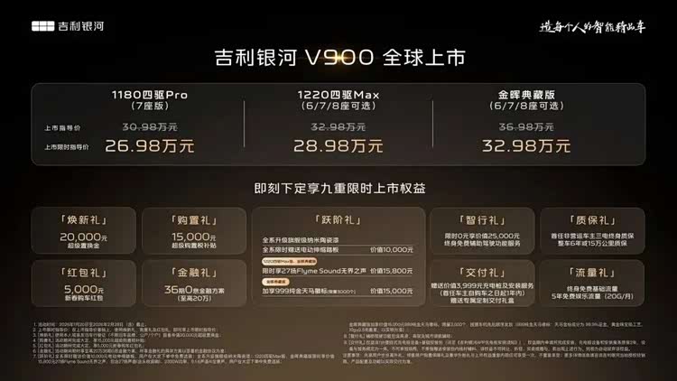 日前,吉利银河汽车旗下的中大型MPV—吉利 银河V900(参数|询价)正式上市,指导价30.98-36.98万,限时价26.98-32.98万。这款新车采用增程动力系统,车身长度超过5.3米,提供6座版、7座版和8座版车型。
