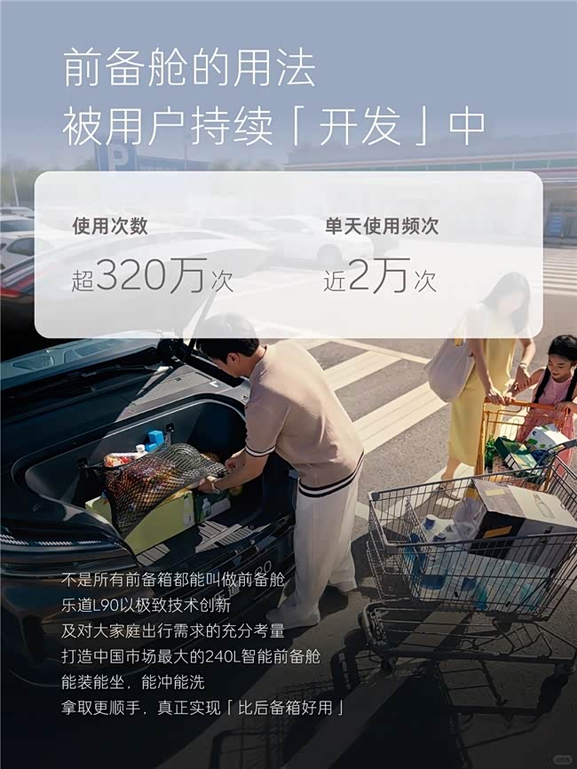 谁能想到,乐道L90的240L前备舱,直接把其他车型前备箱的“摆设”变成了“刚需”。数据显示它的前备舱使用次数超320万次,单天使用近2万次,相当于每个车主每天都得“宠幸”它一回。