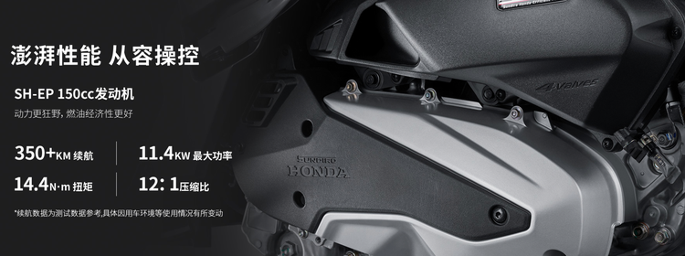 NS150XC搭载本田SH-EP型号的四气门水冷发动机,实际排量149.7cc。最大功率11.4kW/8500rpm,最大扭矩14.4N·m/6500rpm。官方最高车速105km/h,百公里油耗约2.35L。