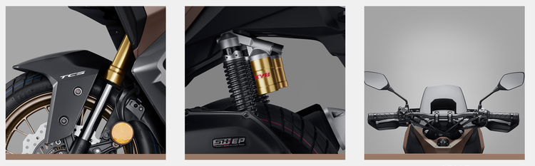 制动系统采用前240mm、后220mm大尺寸浪花碟刹盘,搭配NISSIN卡钳。减震系统使用了KYB金色倒置长行程前减震(行程162mm)和气囊长行程后减震,首次在150踏板上采用双连板前减震结构,提升了非铺装路面的支撑性。轮胎为玛吉斯全地形胎。