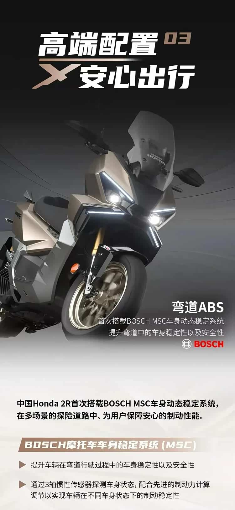配置是NS150XC最突出的部分。安全配置包括博世双通道ABS系统、TCS牵引力控制系统,以及同级别罕见的博世MSC车身稳定系统(弯道ABS)。弯道ABS能在车辆有倾角时更精准地控制制动,提升弯道安全性。