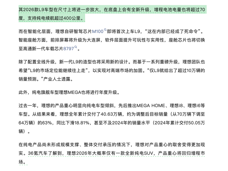 不止新款L9,理想L全系产品或都将进行新一轮升级,其整体战略方向明确—“2026年,重回增程产品的领先地位” 。
