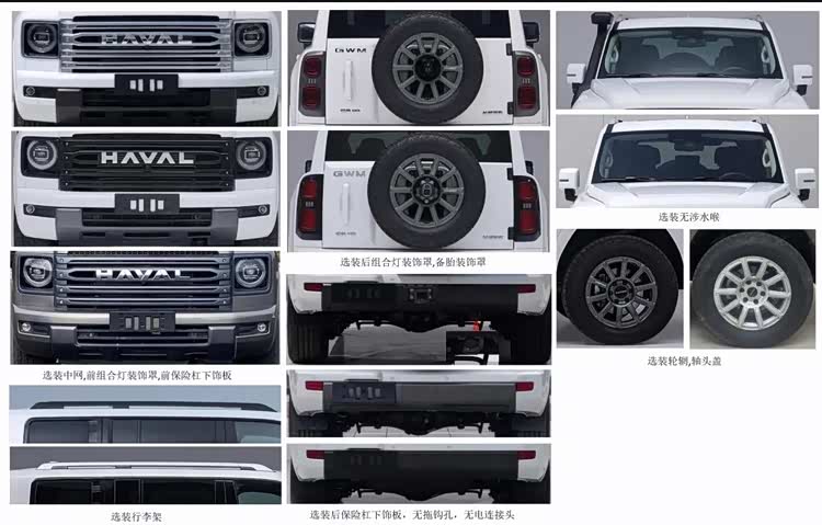 从申报信息来看,新H9将提供极为丰富的选装配置,涵盖车辆各个部位和功能。外观方面,消费者可以选择不同风格的中网、前后保险杠下饰板、行李架、前后组合灯装饰罩*以及备胎装饰罩。对于不需要拖挂功能的用户,车辆还提供“无拖钩孔、无电连接头”选项。