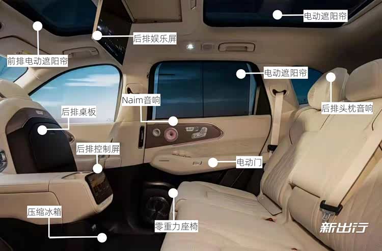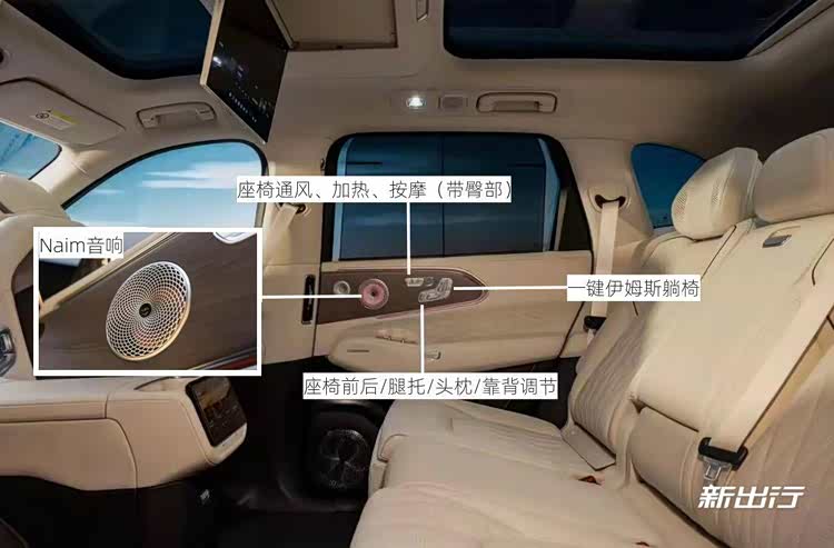 来到后排,配置同样非常丰富,例如后排娱乐屏、零重力座椅、前后分区电动天窗、电动门等配置一应俱全。