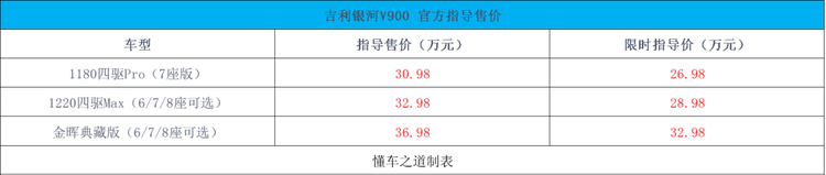 【懂车之道 产品】近日,懂车之道获悉,1月20日,吉利 银河V900(参数|询价)正式发布上市,共推3款配置,官方售价区间为30.98-36.98万元,上市限时指导售价为26.98-32.98万元。下面,和大家一起来看看新车的产品力如何?