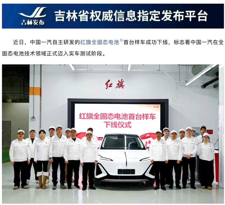 日前,“吉林发布”消息称,中国一汽自主研发的红旗全固态电池首台样车成功下线,标志着中国一汽在全固态电池技术领域正式迈入实车测试阶段。