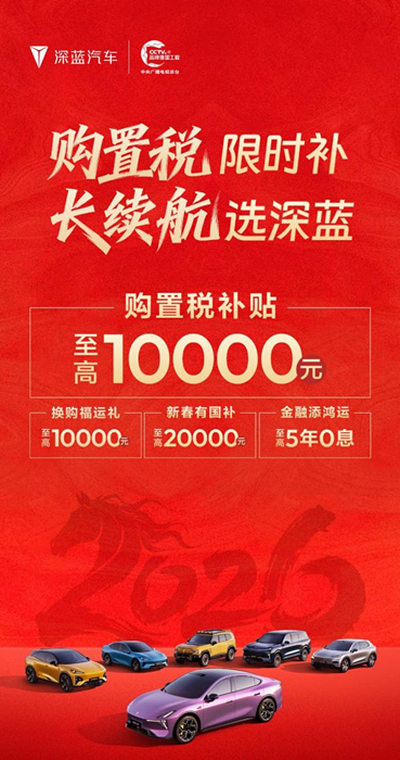 马年行好运,新春购新车。春节前夕正值购车政策红利期,选择深蓝汽车,也就意味着将同时获得“央企品质保障、长续航核心优势、全系限时补贴”三重利好。2026,和深蓝一起,即刻焕新座驾,解锁新春出行新体验!