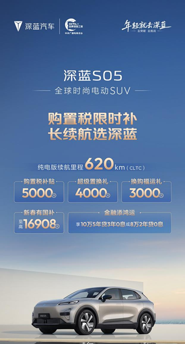 为回馈用户厚爱,现在下订深蓝S05,可享5000元购置税补贴、4000元超级置换礼、3000元换购福运礼、至高16908元新春国补,金融方案同样提供10万5年贷3年0息或8万2年贷0息选择。