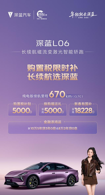 深蓝L06以满满诚意推出多重购车福利,大幅降低智能座驾拥有门槛。消费者购车即享5000元购置税补贴、至高5000元换购福运礼、至高18228元新春国补,金融方案可享10万5年贷3年0息或8万2年贷0息。年轻消费者无需背负高额资金压力,就能轻松入手这款颜值与续航兼备的智能轿跑。