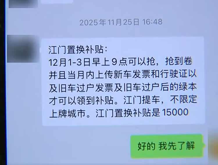 根据陈女士的描述,她原本计划在2025年购车,享受免购置税和国补的双重优惠。然而,随着国补的停止,她的购车计划一度搁浅。直到2025年11月底,特斯拉销售主动联系她,告知有江门置换补贴的信息,补贴金额高达15000元,且提车不限定上牌城市。这一消息让陈女士重新燃起了购车的希望。