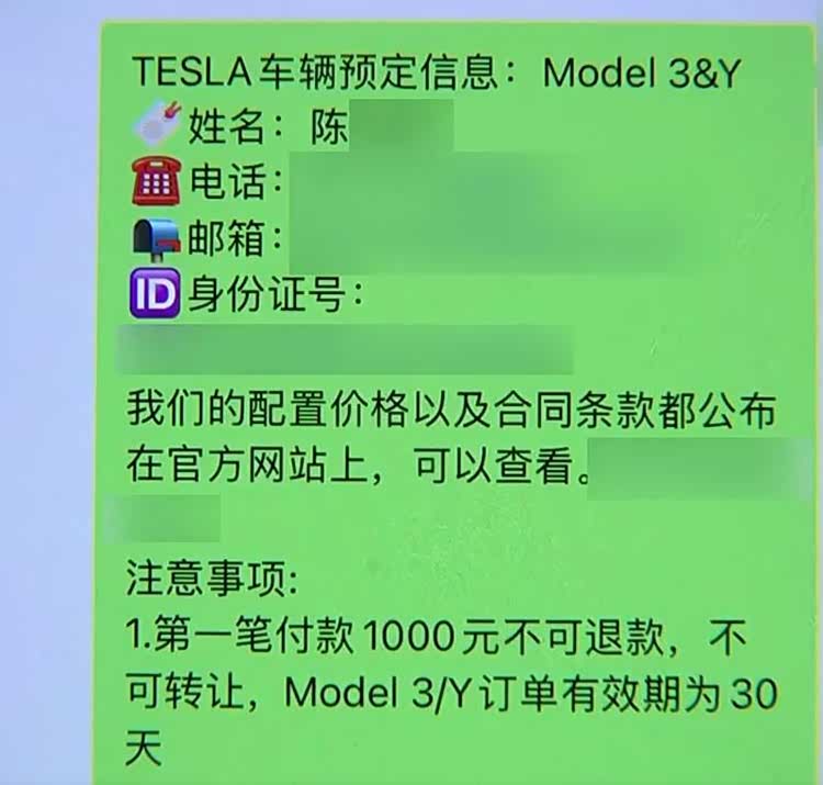 特斯拉方面后来回复称:客户在购车时,订单页面已标明定金不可退款,不可转让,且购车合同中客户在定金缴纳后30天内未提车的,订单将自行取消。