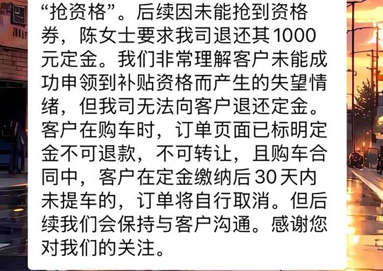 在销售的引导下,陈女士于11月25日填写了车辆预定信息,并支付了1000元定金,订单有效期为30天。销售承诺帮她抢券,陈女士也表示,抢到券且有现车,她就会购车。