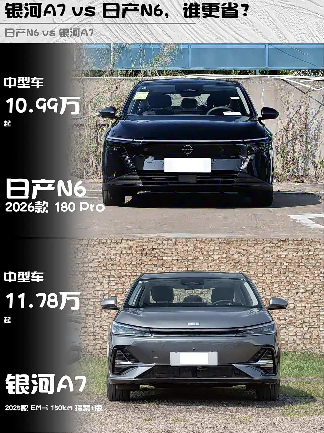 车家号·0浏览·2026-01-22 08:44 · 北京最近在选插混中型车的小伙伴看过来!今天深度对比两款热门车型—— 日产N6(参数|询价) 2026款 180 Pro和银河A7 2025款 EM-i 150km探索+版,实测干货分享给你们~ 🔥