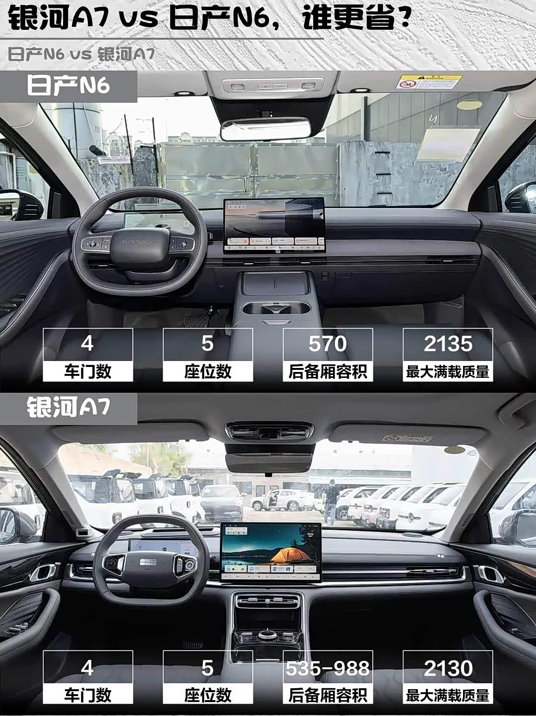银河A7以2845mm轴距胜出,后排能跷二郎腿,后备箱容积535-988L更灵活。N6的570L后备箱虽大,但座椅放倒有坡度。不过N6有26处储物格+母婴级环保材质,带娃家庭更友好。