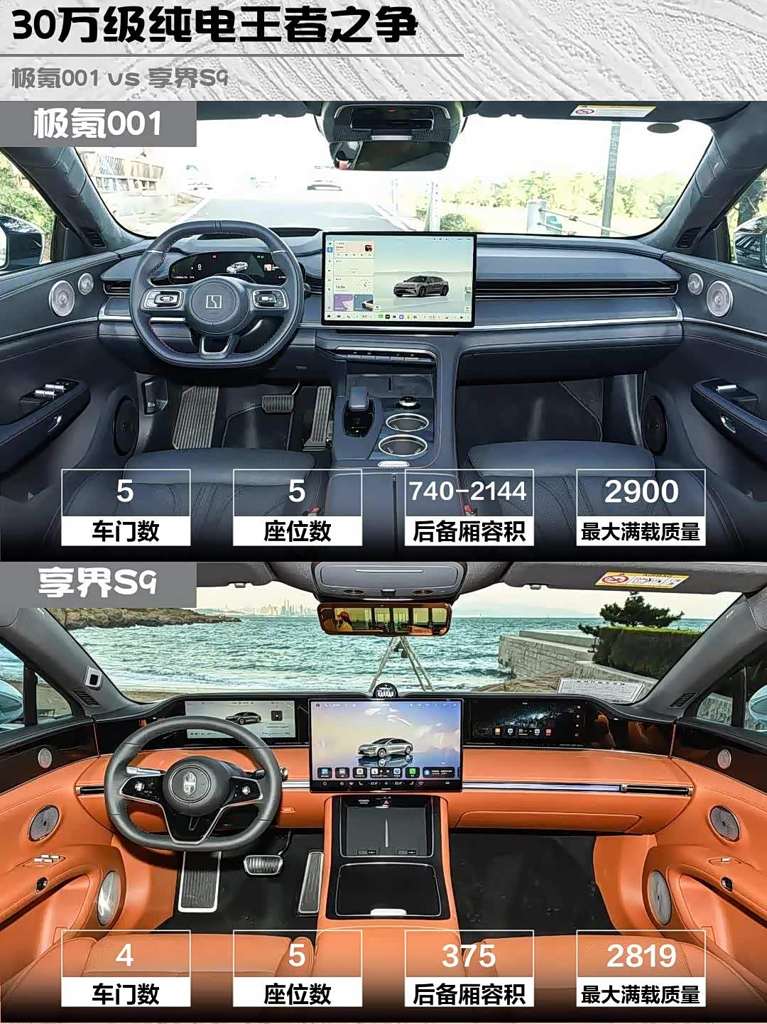 极氪001的猎装车身后备箱最大2144L,能塞下整套露营装备;S9的后排零重力座椅堪比头等舱,但后备箱只有375L。身高185cm实测:极氪001后排腿部3拳,S9能跷二郎腿,但极氪的伊姆斯躺椅对高个子不太友好😅